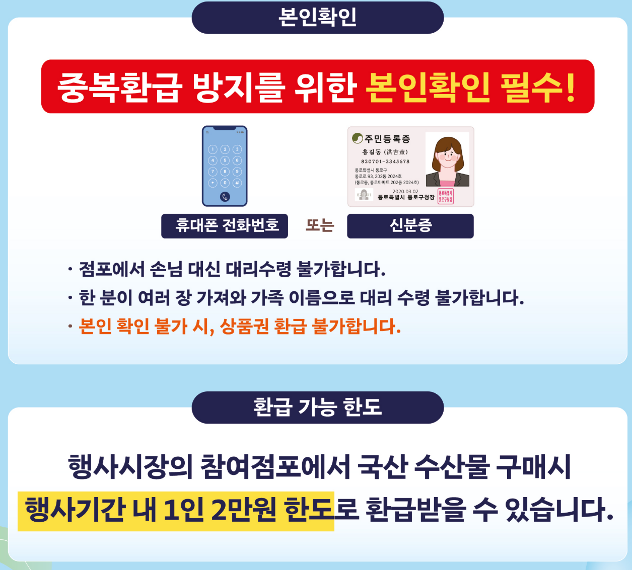 구매 영수증과 신분증 또는 휴대전화를 가지고 해당 시장 내 환급 부스를 방문하면, 본인 확인 후 최대 2만 원까지 온누리상품권으로 환급받을 수 있다.
