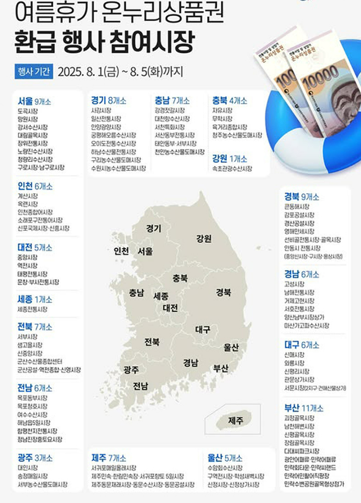 그 중 하나로 2025년 8월 1일부터 8월 5일까지 전국 101개 전통시장에서 ‘온누리상품권 환급행사’가 열린다.