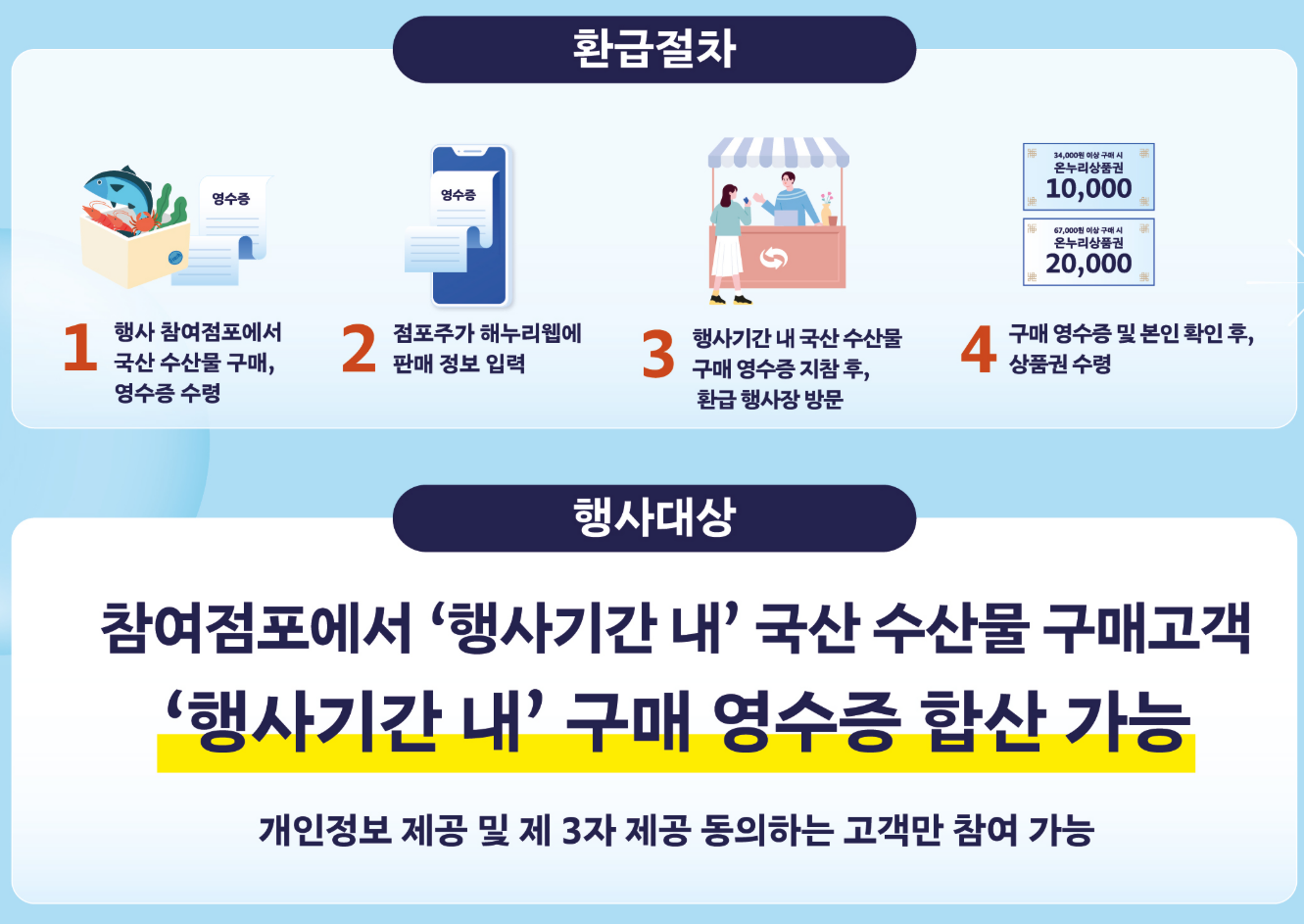 수산물을 3만4천 원 이상 6만7천 원 미만으로 구매한 경우 1만 원, 6만7천 원 이상 구매한 경우에는 2만 원의 온누리상품권을 환급받을 수 있다.