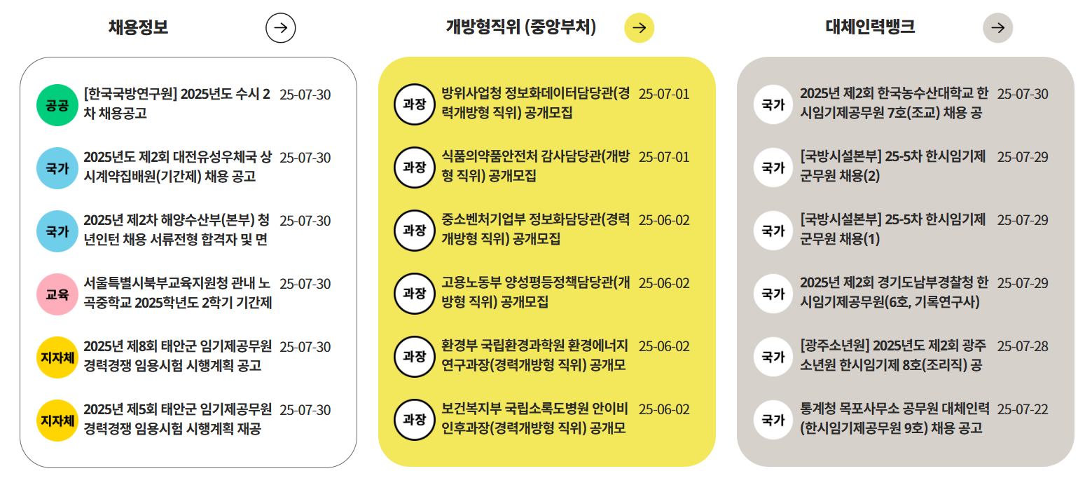 일반 채용은 물론 상시 모집과 대체 인력 채용, 공모직위와 개방형직위 정보를 포함합니다 내외부 모든 국민에게 공직 및 공공기관 채용 정보를 제공하고 있습니다.