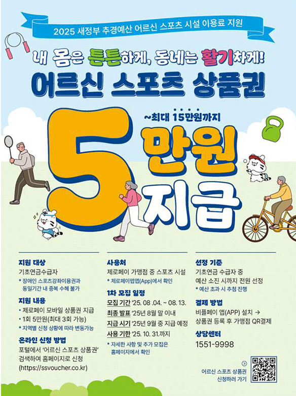 이번 사업은 단순한 상품권 지원을 넘어서, 어르신들이 일상 속에서 체육 활동을 쉽게 접하고 건강을 지키는 데 실질적인 도움이 될 수 있도록 구성된 정책입니다. 체육활동을 통해 신체뿐 아니라 정서적으로도 안정된 노후 생활을 누릴 수 있기를 바랍니다.
