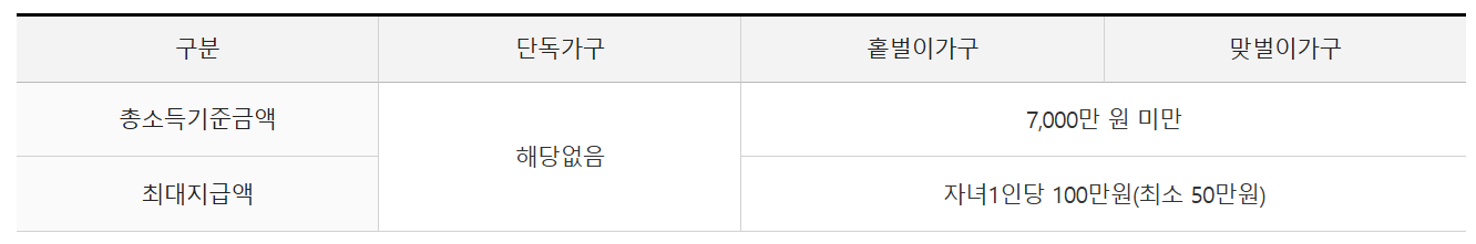 부부합산 연간 총소득이 7,000만 원 미만이면서 18세 미만 부양자녀가 있는 경우 1인당 최대 100만 원(최소 50만 원)을 지급합니다.