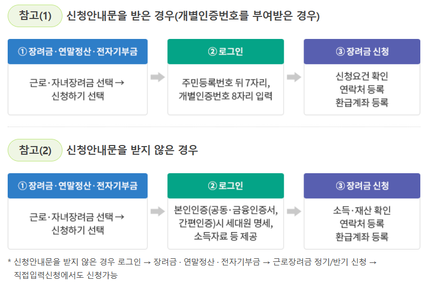 신청은 반기신청과 정기신청으로 나뉘며, 근로소득만 있는 경우 반기 또는 정기 중 선택할 수 있습니다.