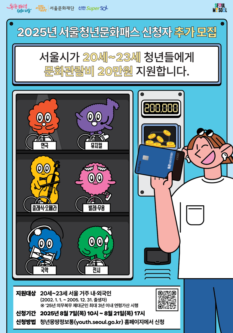 서울청년문화패스는 청년들의 문화 향유권을 보장하고 문화예술 분야 소비와 창작 활동을 활성화하기 위해 추진되었습니다. 이번 추가 모집은 2025년 8월 7일자로 공고되었으며, 약 6천 명의 서울 거주 청년을 대상으로 지원합니다.