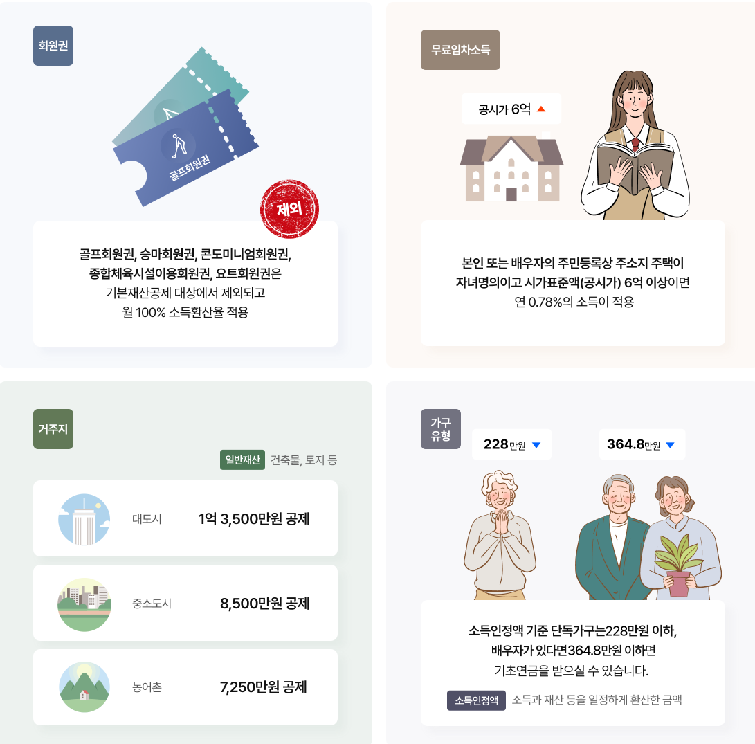 소득인정액이 기준 이하인 경우 대상이 되며, 2025년 기준 금액은 다음과 같습니다: