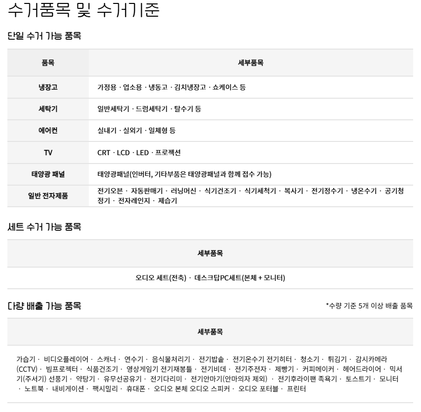 기타 대형 품목: 전기오븐, 자동판매기, 러닝머신, 식기건조기, 전자레인지, 공기청정기, 복사기 등