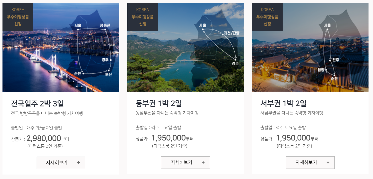 해랑열차는 크게 전국일주 2박3일, 동부권 1박2일, 서부권 1박2일 코스를 운행합니다.