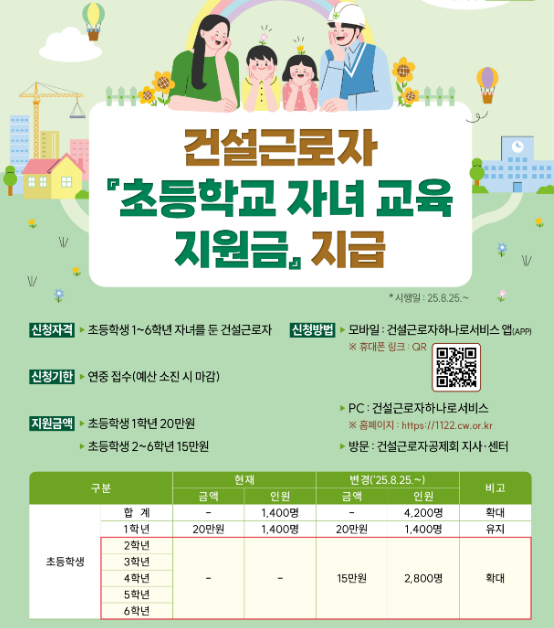 이번 지원은 총 4억 2천만 원 규모이며, 초등학생 자녀를 둔 건설근로자라면 누구나 신청할 수 있습니다.