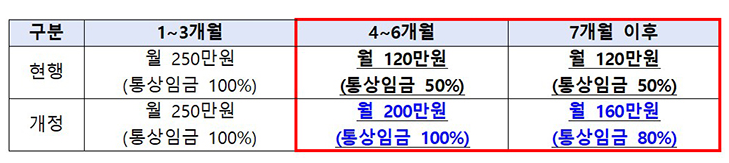 급여 구조는 첫 3개월 동안 통상임금의 100%를 지급하되, 월 최대 250만 원으로 상한이 설정되어 있었습니다.