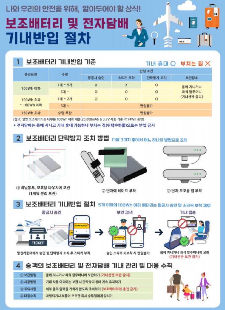 이러한 규정은 보조배터리와 전자담배 모두 리튬배터리 폭발 위험성을 줄이기 위한 조치로, 탑승 전 반드시 확인이 필요합니다.